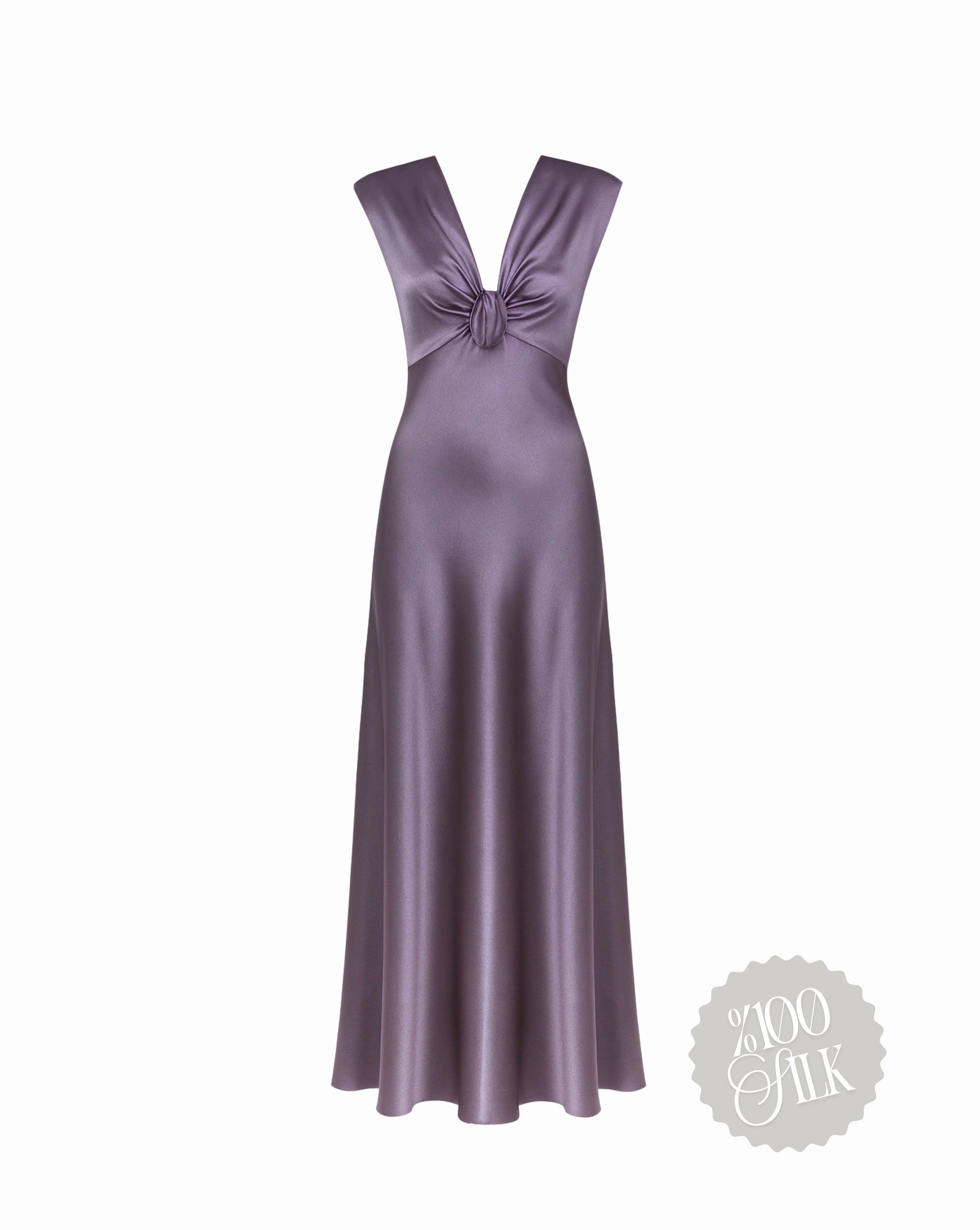 The plunging V-neckline is accentuated by a sculptural knot detail at the bodice, adding depth and artistry to the minimalist design. Wide shoulder straps balance the neckline, while the floor-length cut flows gracefully with every step, radiating understated sophistication.