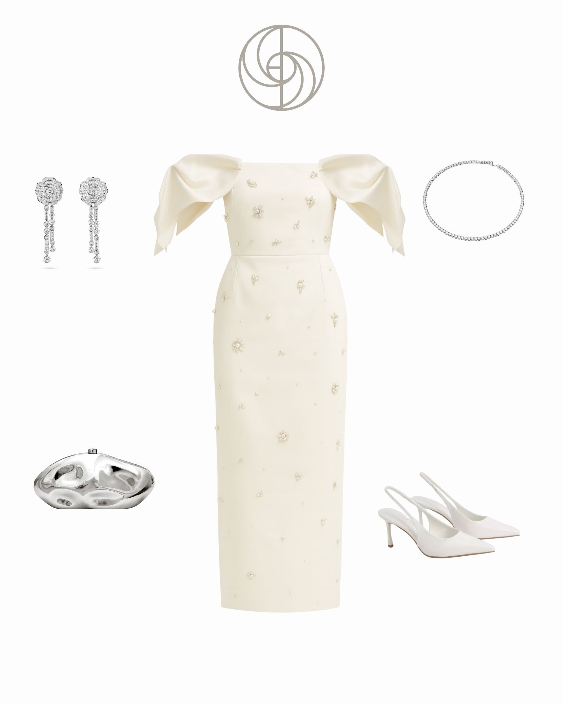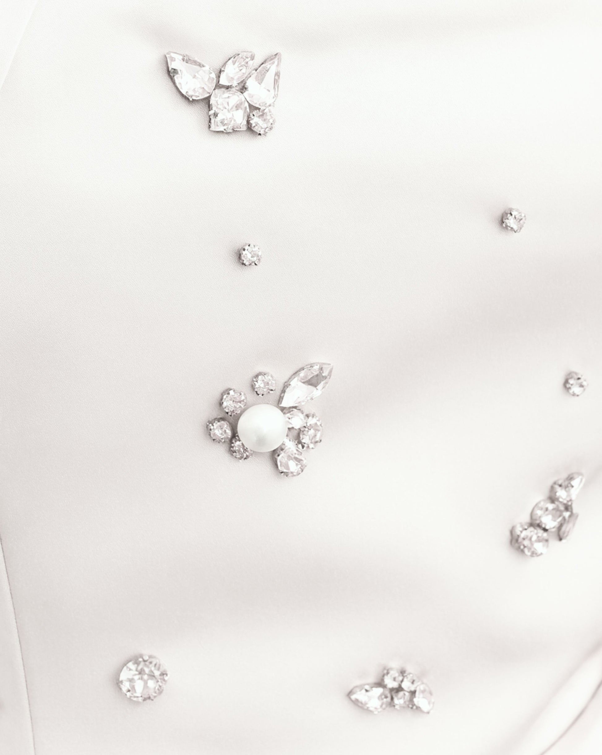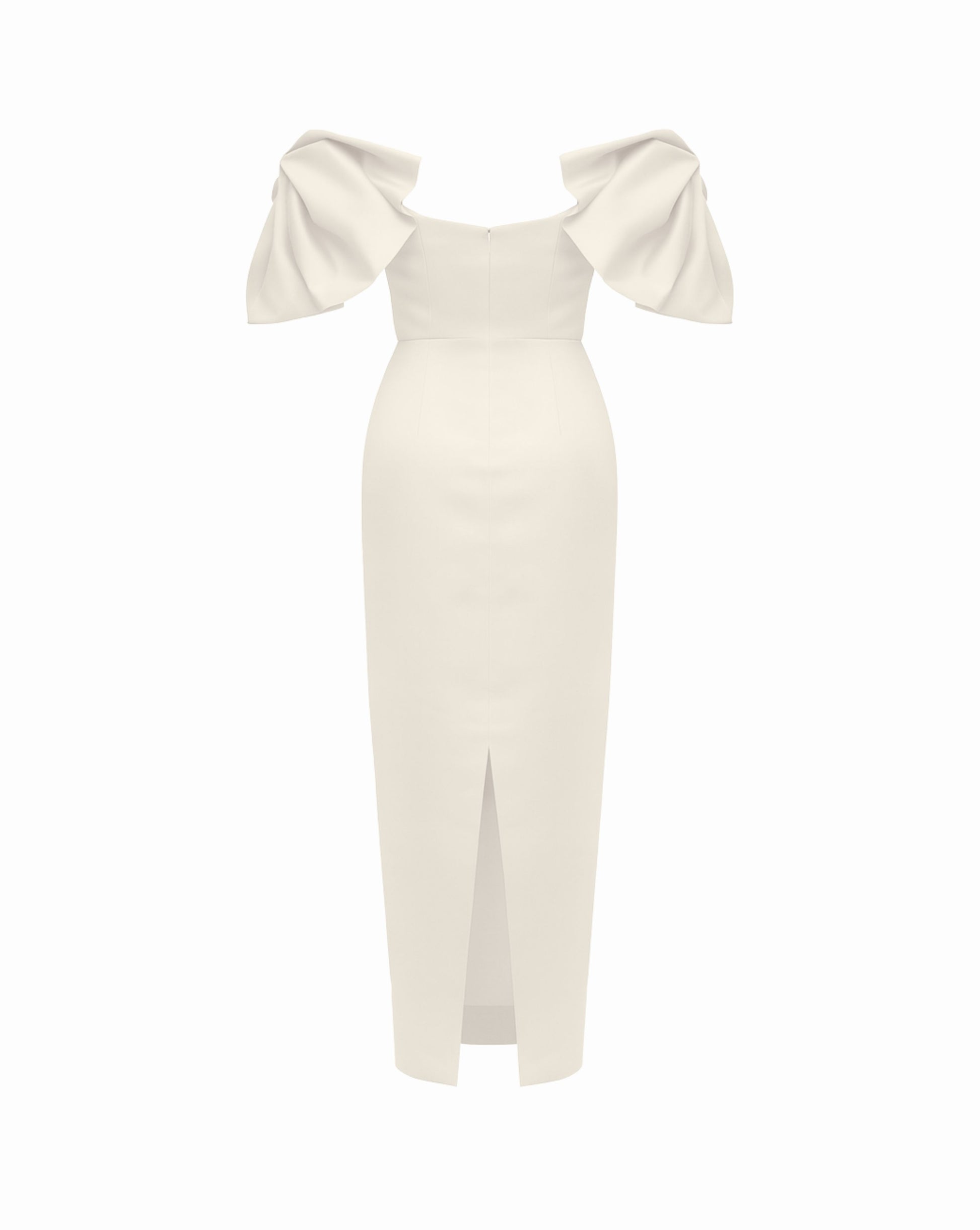 A vision of timeless refinement, the Ivory Grace at Bosphorus Gown captures sophistication in a serene ivory palette. The structured silhouette is elevated with sculptural off-shoulder sleeves, while delicate pearl and crystal embellishments bring a touch of couture artistry. Its floor-length design flows gracefully, making it a refined choice for weddings, evening receptions, and grand celebrations.