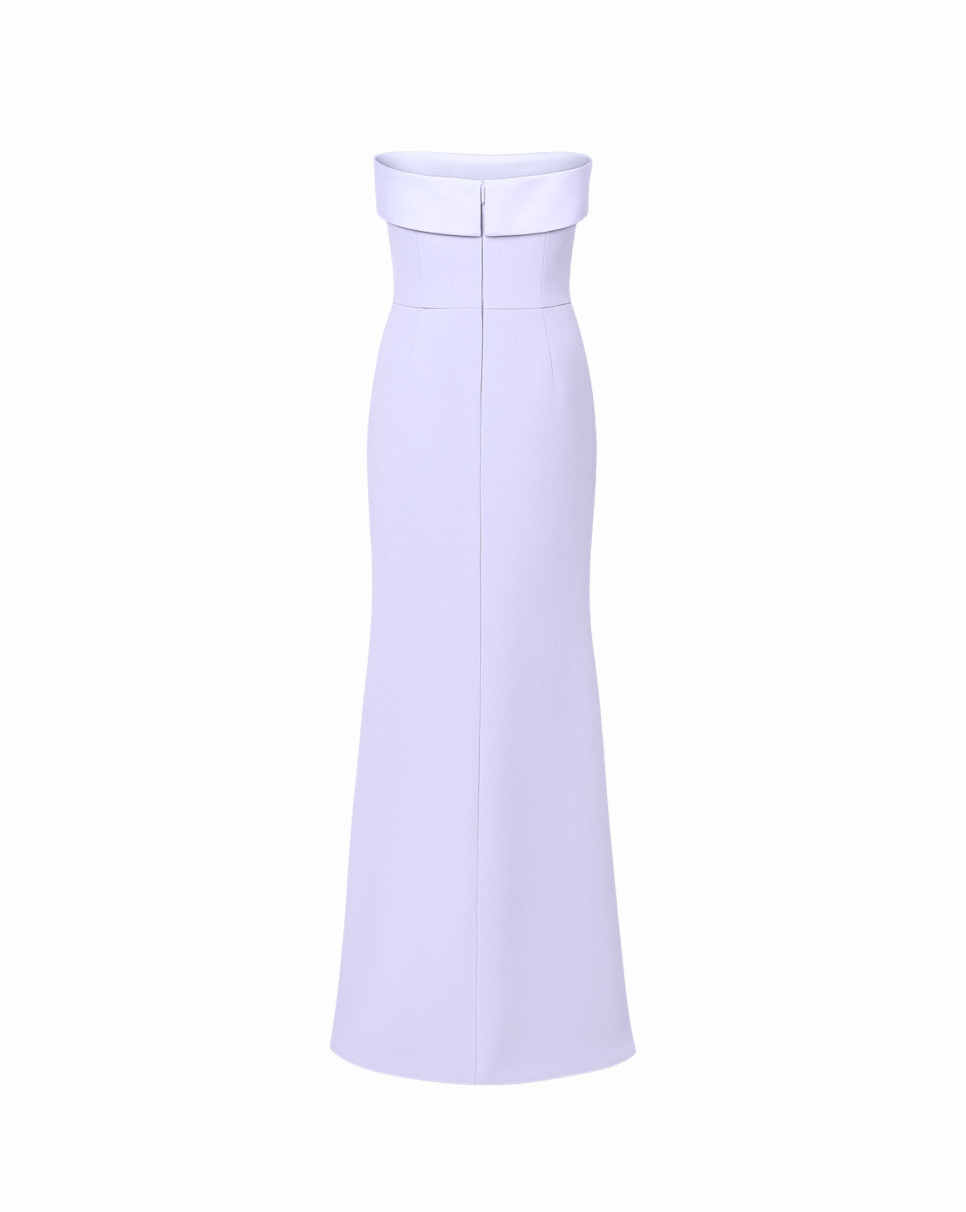 A timeless statement of elegance, the Lavender Symphony Gown harmonizes refined fabrics with modern sophistication. Crafted with a sleek, body-contouring crepe base and elevated by a lustrous satin fold-over neckline, this strapless gown flows into a graceful floor-length silhouette. Its minimalist yet structured design captures the poetic charm of soft lilac tones, making it a modern classic for any refined occasion.