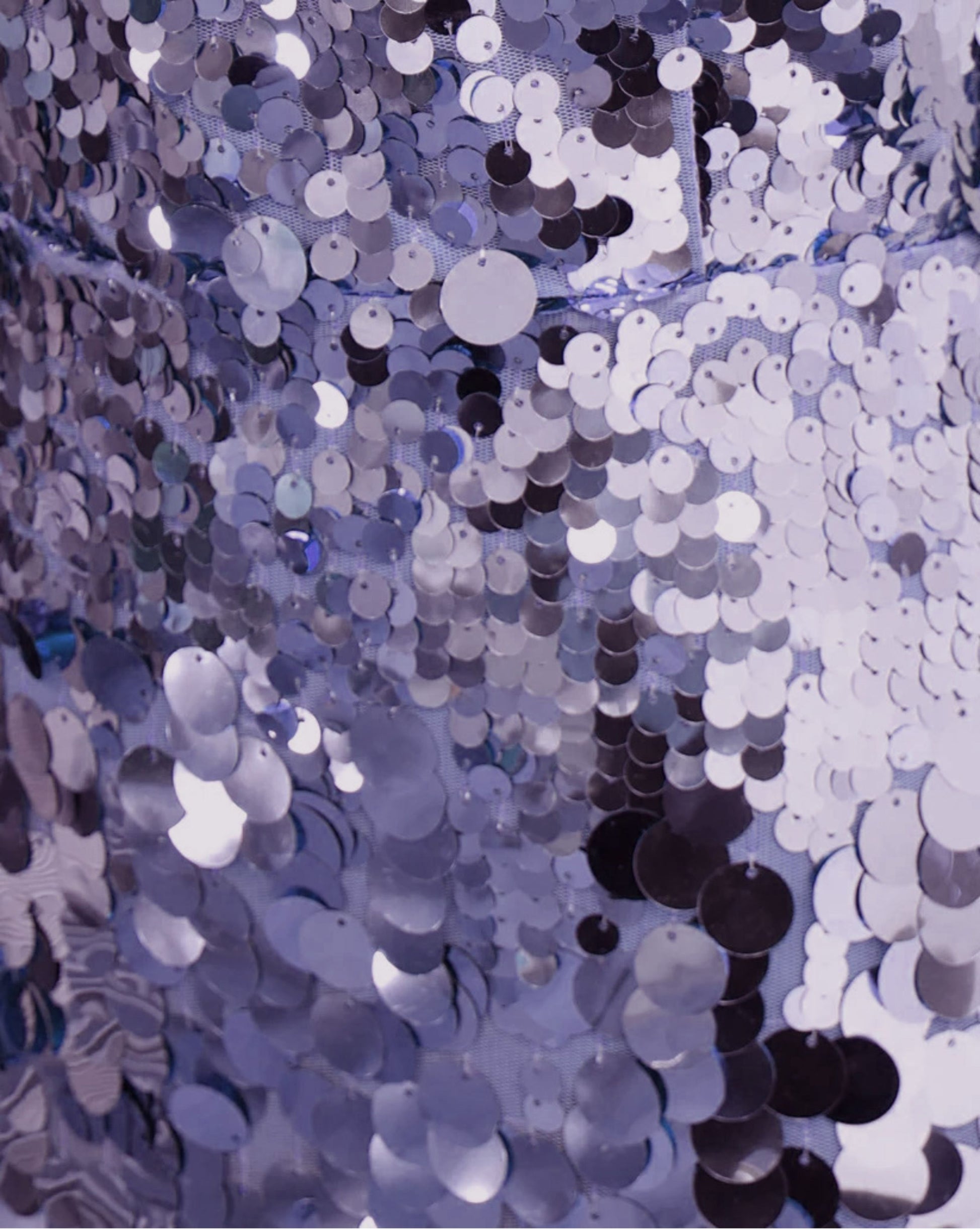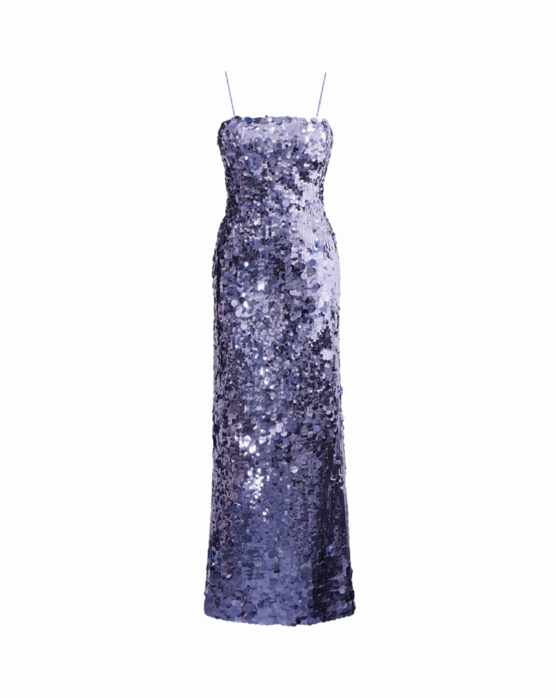 The Violet Soirée Gown, crafted from a rich violet satin blend and fully lined for comfort, dazzles with hand-applied sequins in tonal violet and silver. Its sleek, body-contouring silhouette with delicate straps and a subtle train captures the mystery of a starlit sky, making it perfect for red-carpet moments and evening galas.
